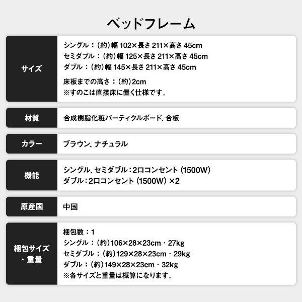 ベッド 低床 ロータイプ すのこ 木製 宮付き 棚付き コンセント付き シンプル 和 モダン ナチュラル セミダブル ベッドフレームのみds-2333120