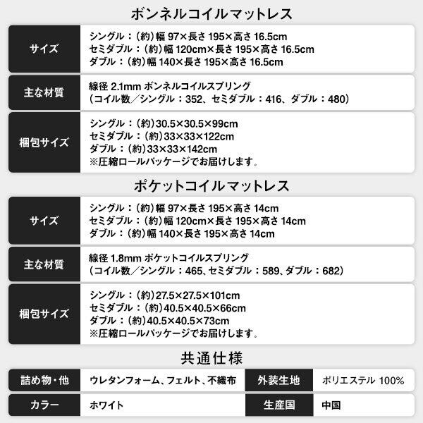 本商品はお取り寄せ商品のため、稀にご注文入れ違い等により欠品・遅延となる場合がございます。誠に恐れ入りますが、何卒ご了承ください。 また、以下の場合には追加送料がかかる場合がございます。 ・沖縄、離島および一部地域への配送時 ・同梱区分が異なる商品の複数購入時 【出荷目安】:即日 - 1営業日 ※土日・祝除く 【同梱区分】:TS 1 【梱包サイズ】:通常商品 【型番】b201s size:d color:bk option:bc 【高級モダンの象徴/High Quality Modern】 1:Design/高級感あふれるモダンデザイン 2:Head board/コンセント付ヘッドボード 3:Storage/2杯の引き出し収納 4:Variation/選べる3サイズ×2カラー 【高級感あふれるモダンデザインベッド】 シンプルなデザインに機能をしっかりと付けたベッドです。 直線的なフォルムで、モダンでスタイリッシュな寝室に。 【棚&コンセント付き】 棚は前板が出ているのでスマホなどが落ちることなく、 ティッシュ箱も置ける幅です。 ダブルサイズは左右両側に2口×2つ、 シングル、セミダブルは右側に2口×1つのコンセントが付いています。 【木目加工が醸し出す高級感】 木目は自然な風合いを生むエンボス加工。 お部屋がお洒落なモダンテイストに。 【ワンランク上のメラミン樹脂加工板】 メラミン樹脂加工板とは安価な紙張りの合板よりも 水、キズ、汚れに強く、耐傷、耐水性が求められる カウンター天板などに多く使われている材質です。 【キャスター付き2杯収納】 ベッド下には2杯の引き出し収納が付いています。 キャスター付きで出し入れ楽々。 引き出しは、左右どちらにも取り付け可能。 ※引出しを設置しない反対側は大きな空間になっており、フリーエリアとして収納も可能です。 【湿気に強く、カビにくい】 床板と引き出し底板にも化粧を施しました。 それにより、湿気に強くカビにくく、いつでも清潔にお使いいただけます。 底板の桟に緩衝シール付き※お客様貼り付けになります。 【耐荷重200kgの頑丈構造】 抜群の耐荷重を実現するクロス構造を採用し、さらに金属プレートで しっかりベッドを固定したガタつきのない頑丈構造です。 ※クロス構造はダブル、セミダブルサイズのみです。 ※シングルサイズの耐荷重は120kgです。 【2台並べても】 スッキリとしたデザインだから、2台並べても圧迫感なく、隙間もできません。 【COLOR VARIATION】 WHITE ホワイト 薄桜のような温かみのある「ホワイト」は圧迫感を抑えながらお部屋を明るく見せます。 BLACK ブラック 落ち着いていて引き締まった印象の「ブラック」はお部屋に高級感を与えます。 【お買い得マットレスセットもご用意】 1年保証 1 Year Waranty ポケットコイルマットレス 身体にフィットでぐっすり 硬さ:ふつう/身体にフィット/振動少なめ/1年保証/ロール梱包 スプリングが独立している構造。身体を「点」で支えます。 体圧分散を重要視する方/揺れや振動を気にされる方 ボンネルコイルマットレス 高い耐久性であんしん 硬さ:かため/耐久性/通気性/1年保証/ロール梱包 スプリングが「連結している構造。身体を「面」で支えます。 耐久性を重視される方/湿気・カビが気になる方 Point 体をしっかり支えるハリのある側地 不織布を縫い込んだ肉厚で張りのある生地を使用し、 細部までこだわっています。 Check 搬入ラクラク!圧縮ロール梱包 原寸大で届くマットレスとは違い、 圧縮ロールパッケージなので搬入がとってもスムーズ。 工場で圧縮しているので衛生面も安心です。 ※開封してから15分後には約80%復元、24時間後には約97%まで回復します。 【SIZE】 3サイズ展開(シングル、セミダブル、ダブル) ※シングルサイズは床板4分割、セミダブル・ダブルサイズは床板8分割です。 ※ご注意事項 ベッドフレームには必ずスプリングマットレスを乗せてご使用ください。 布団や薄型のマットレスのみの使用等でご使用いただいた場合、 状況によっては商品の破損を招く可能性がございます。 【ベッドフレーム本体】 ■サイズ シングル:(約)幅97x長さ210x高さ69cm セミダブル:(約)幅120x長さ210x高さ69cm ダブル:(約)幅140x長さ210x高さ69cm 床板までの高さ:(約)24cm 引き出し有効内寸:(約)横92x奥行37x高さ8cm ■材質 合成樹脂化粧パーティクルボード ■カラー ブラック、ホワイト ■機能 シングル、セミダブル:2口コンセント(1500W) ダブル:2口コンセント(1500W)×2 ■品質保証 1年間 ■生産国 中国 ■梱包サイズ・重量 梱包数:3 シングル:(約)101x27x14cm・10kg、100x43x12cm・7kg、97x49x12cm・10kg セミダブル:(約)122x27x14cm・15kg、100x43x12cm・7kg、61x49x21cm・12kg ダブル:(約)144x27x14cm・20kg、100x43x12cm・7kg、74x49x21cm・14kg ※各サイズ・重量は概算です。 ■商品に関するご注意 ・この商品はスプリングマットレスの使用を前提に設計されています。 床板の上に直接乗ったり、薄手のマットレスや布団で使用すると、 床板が破損する恐れがあります。 ・本製品はお客様組立品です。プラスドライバーをご用意ください。 ・写真の色調はモニターの機種や設定により実際の商品と