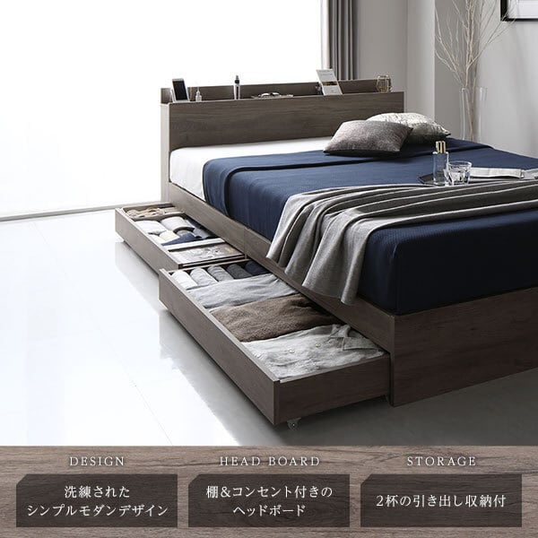 ベッド ダブル ベッドフレームのみ グレージュ 収納付き 引き出し付き 棚付き 宮付き コンセント付き 木目調ds-2423253