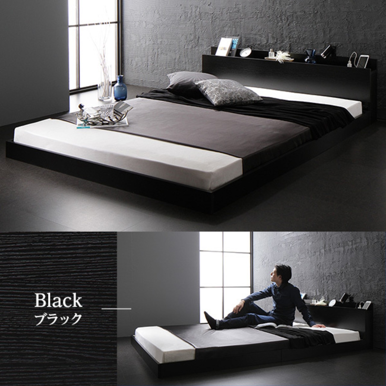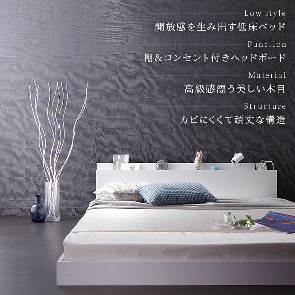 ベッド 低床 ロータイプ すのこ 木製 宮付き 棚付き コンセント付き シンプル モダン ブラック セミダブル ポケットコイルマットレス付きds-2246153