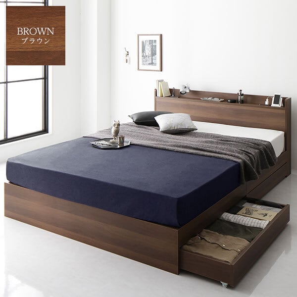 ベッド 収納付き 引き出し付き 木製 棚付き 宮付き コンセント付き シンプル モダン ブラウン セミダブル ポケットコイルマットレス付きds-2173658