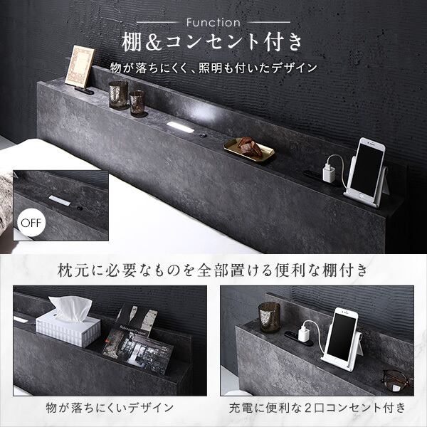 ベッド ダブル ポケットコイルマットレス付き ストーングレー 低床 すのこ 照明付 棚付き 宮付き コンセント付 ローベッドds-2499918